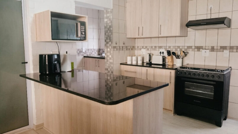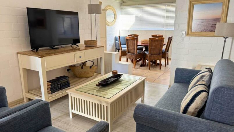 The spacious open-plan living area is perfect for relaxing after a day at the beach, featuring a Smart TV box and fast, reliable WiFi. A true highlight is the dedicated indoor braai room, thoughtfully set up for effortless entertaining in any weather. The round dining table comfortably seats six, creating a wonderful space for shared meals and memorable evenings. The fully equipped kitchen ensures a hassle-free stay with a gas stove, electric oven, air fryer, dishwasher, and fridge-freezer.