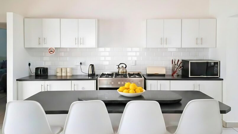 The fully equipped open-plan kitchen has everything needed for effortless meal preparation, including a dishwasher and washing machine for added convenience. The breakfast counter with barstools offers a casual dining space for quick snacks or morning coffee.