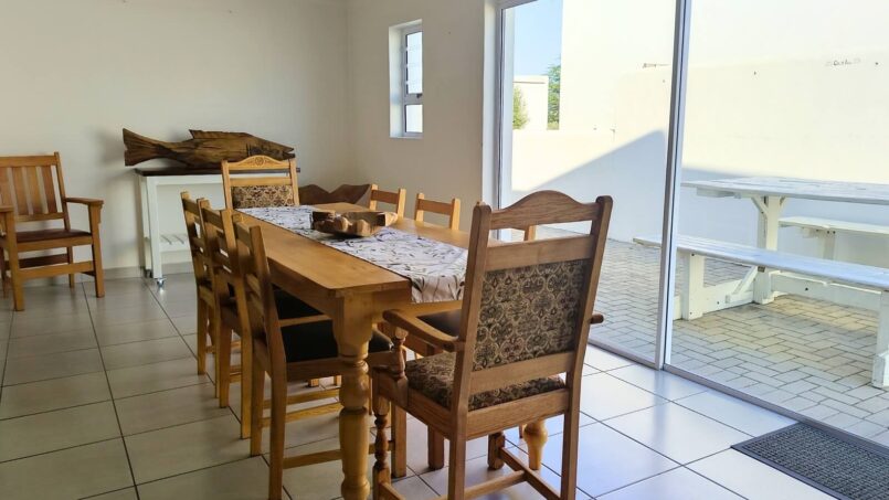 The open-plan design seamlessly flows into the living and braai area, creating a warm and inviting atmosphere. The lounge features comfortable sofas and a Smart TV for your own streaming accounts. The indoor braai area is furnished with a picnic table and chairs, perfect for a relaxed dining experience regardless of the weather.