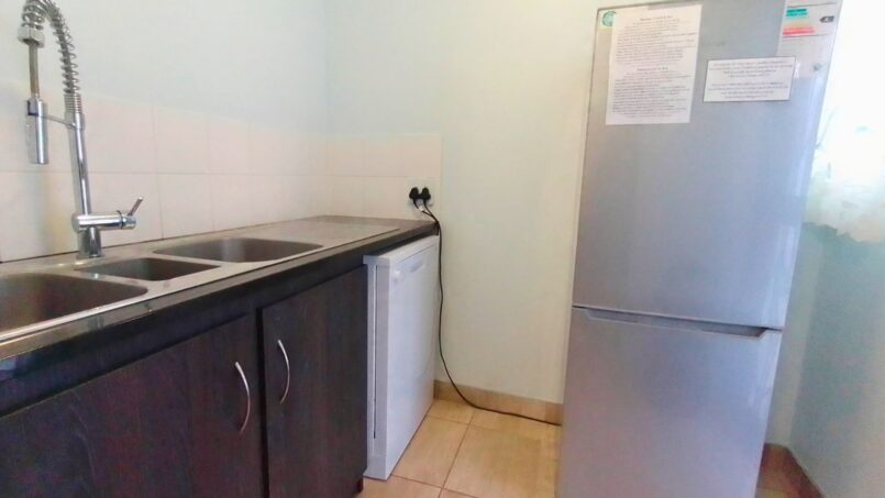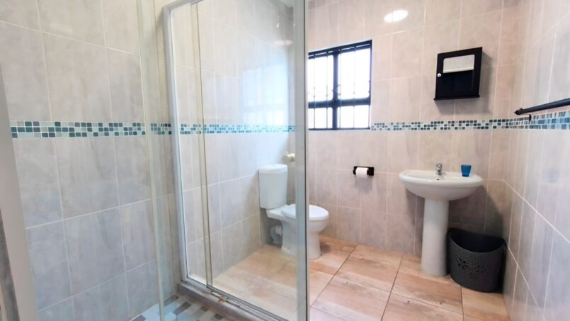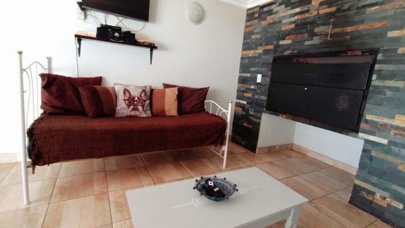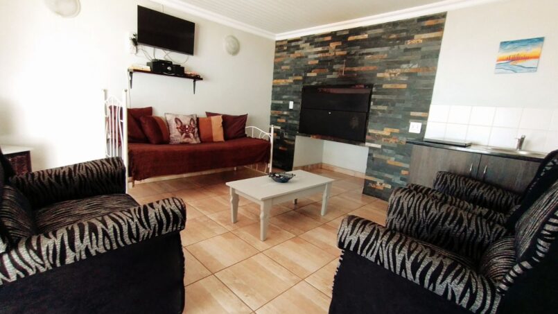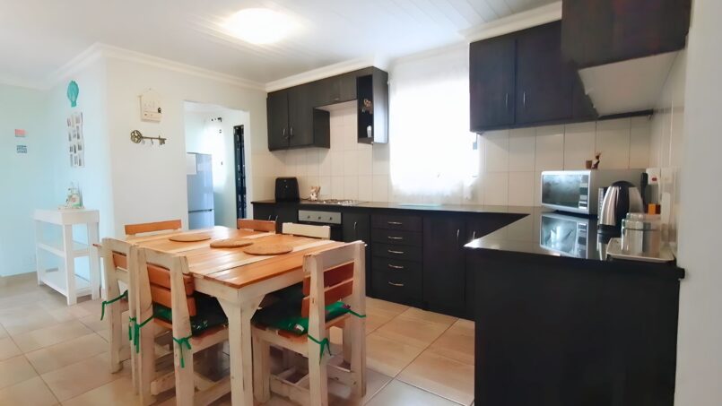 At the heart of the home is an open-plan kitchen, thoughtfully equipped for self-catering with a dishwasher, washing machine, tumble dryer, and a dining table for six—making mealtimes easy and enjoyable. Flowing from the kitchen, the main living area includes a built-in braai, seating, and a Smart TV with fiber internet for smooth streaming. Optional DStv Premium access is also available at an additional cost.