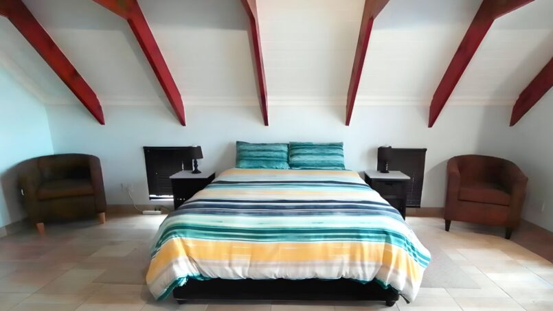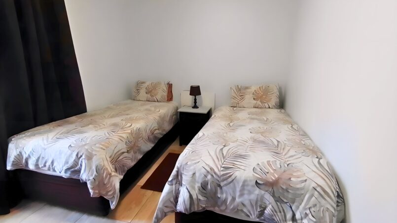 The upstairs main bedroom offers a sense of space and calm, furnished with a queen-size bed and generous closet space—ideal for longer stays. It also features a private en-suite bathroom with a walk-in shower and toilet. Downstairs, the second bedroom has a double bed, while the third is fitted with two single beds. These rooms share a well-appointed bathroom with a shower and toilet. A double sleeper couch in the upstairs lounge adds flexibility, perfect for two children.