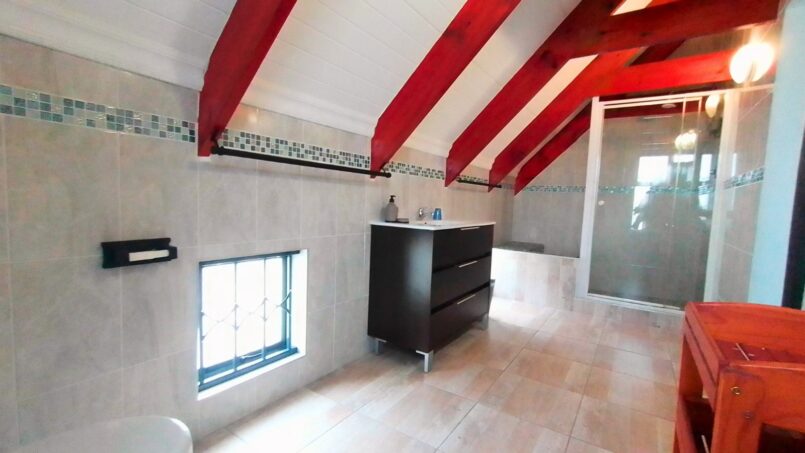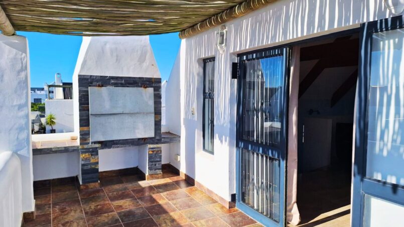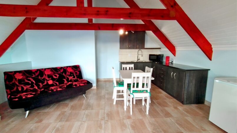 Upstairs, a second open-plan lounge combined with a convenient mini kitchen makes braai time a breeze. This versatile space includes a seating area, a table for four, and the sleeper couch, offering extra room for relaxing or entertaining. It opens onto a balcony with a second built-in braai and sweeping ocean views, making it the perfect setting for a relaxed evening braai with family or friends.
